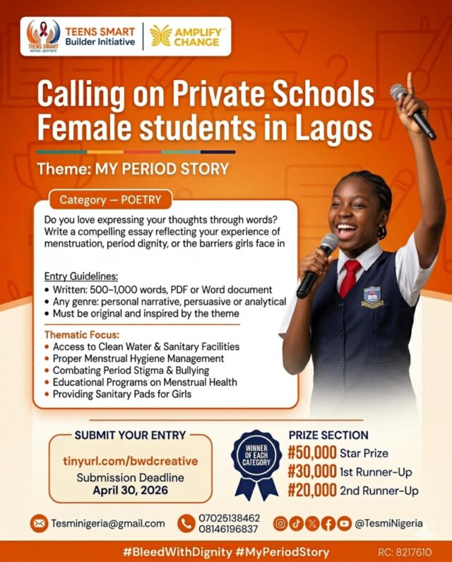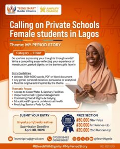 Teens Smart Builders Initiative (TESMI), a Nigerian youth-led nonprofit advancing adolescent sexual and reproductive health rights, has announced the My Period Story Essay Competition 2026  a creative advocacy competition designed to commemorate Menstrual Hygiene Day (May 28, 2026) and amplify the findings of TESMI’s 2025 Bleeding in Silence research, a landmark school-based menstrual hygiene survey that exposed the depth of period poverty, stigma, and neglect facing adolescent girls in Nigerian private schools.